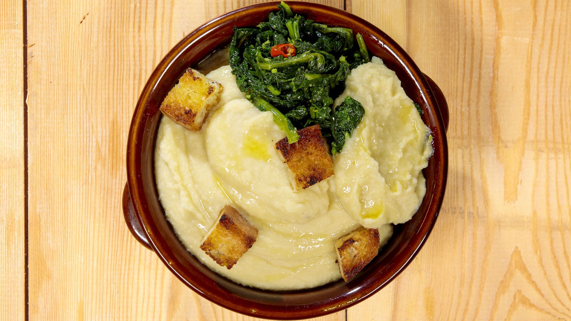 Una volta che la purea di fave avrà terminato la cottura assaggiate e regolate di sale, unite ancora un giro di olio mescolate e servitela in delle cocottine insieme alle cime di rapa saltate e i cubotti di pane croccante, completate unendo un giro di olio EVO.