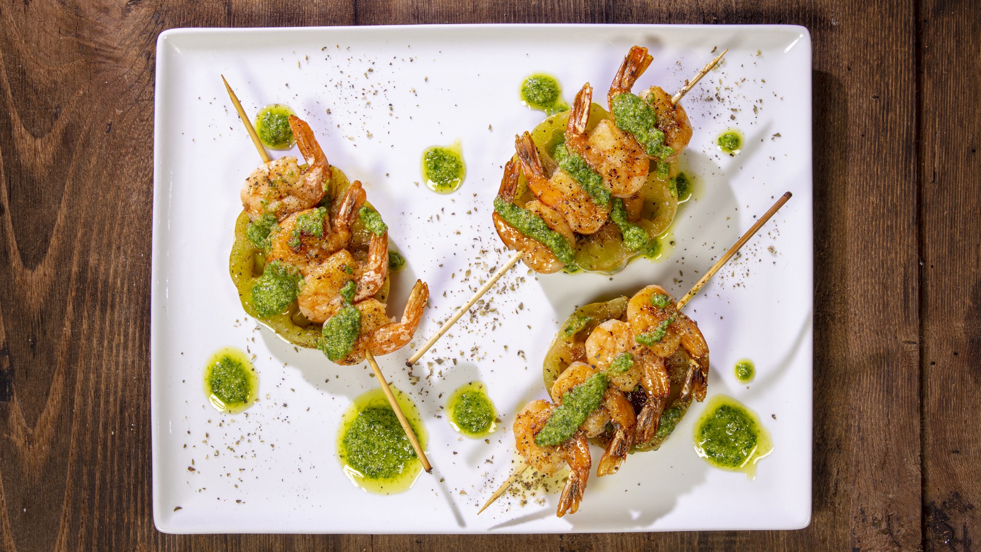 Disponete gli spiedini sulle fette di pomodoro preparate in precedenza e condite con qualche cucchiaio di pesto a piacere.